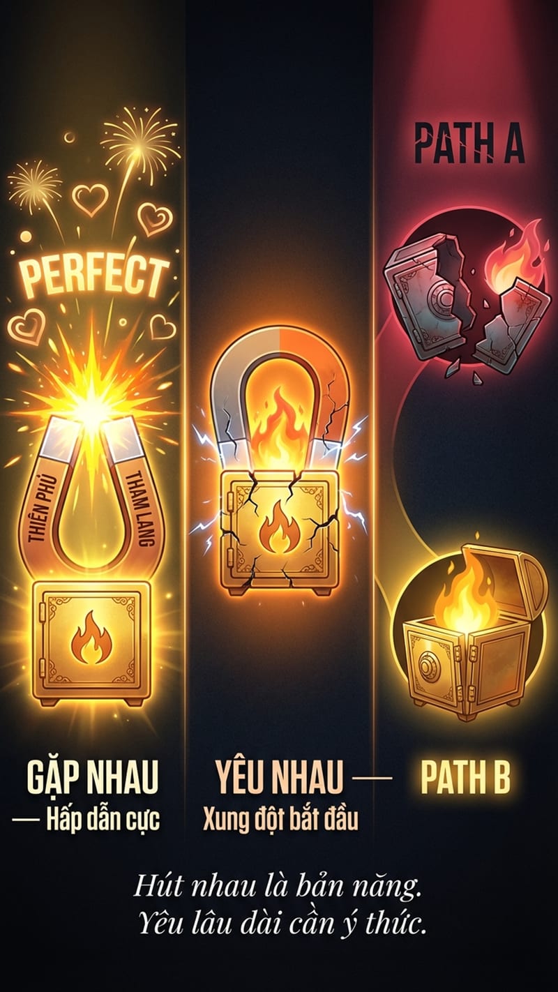 Nhưng bù trừ không có nghĩa là hợp. Tham Lang gặp Thiên Phủ hút nhau cực mạnh giai đoạn đầu — nhưng lâu dài thì xung đột. Người này muốn tự do, người kia muốn ổn định. Hút nhau không phải yêu nhau — hút nhau là bản năng, yêu nhau lâu dài cần ý thức.