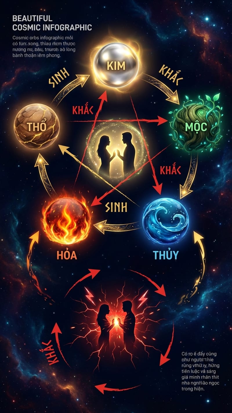 Mỗi người sinh ra mang một mệnh Ngũ Hành: Kim, Mộc, Thủy, Hỏa, Thổ. Hai người muốn hợp thì mệnh phải tương sinh. Kim sinh Thủy thì thuận lợi. Nhưng Kim gặp Kim? Hai cái cứng đập vào nhau, không ai nhường, sống lâu va chạm liên tục.