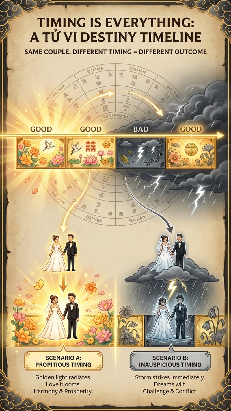 Và yếu tố mà 99 phần trăm người bỏ qua — thời điểm cưới. Mỗi người có Đại Hạn 10 năm và Lưu Niên từng năm. Cưới đúng năm tốt thì nền tảng vững. Cưới sai năm thì dù hợp nhau mọi thứ vẫn khó. Cặp yêu 5 năm kia có thể hợp nhưng cưới sai năm. Đợi thêm 1 đến 2 năm, câu chuyện có thể khác hoàn toàn.