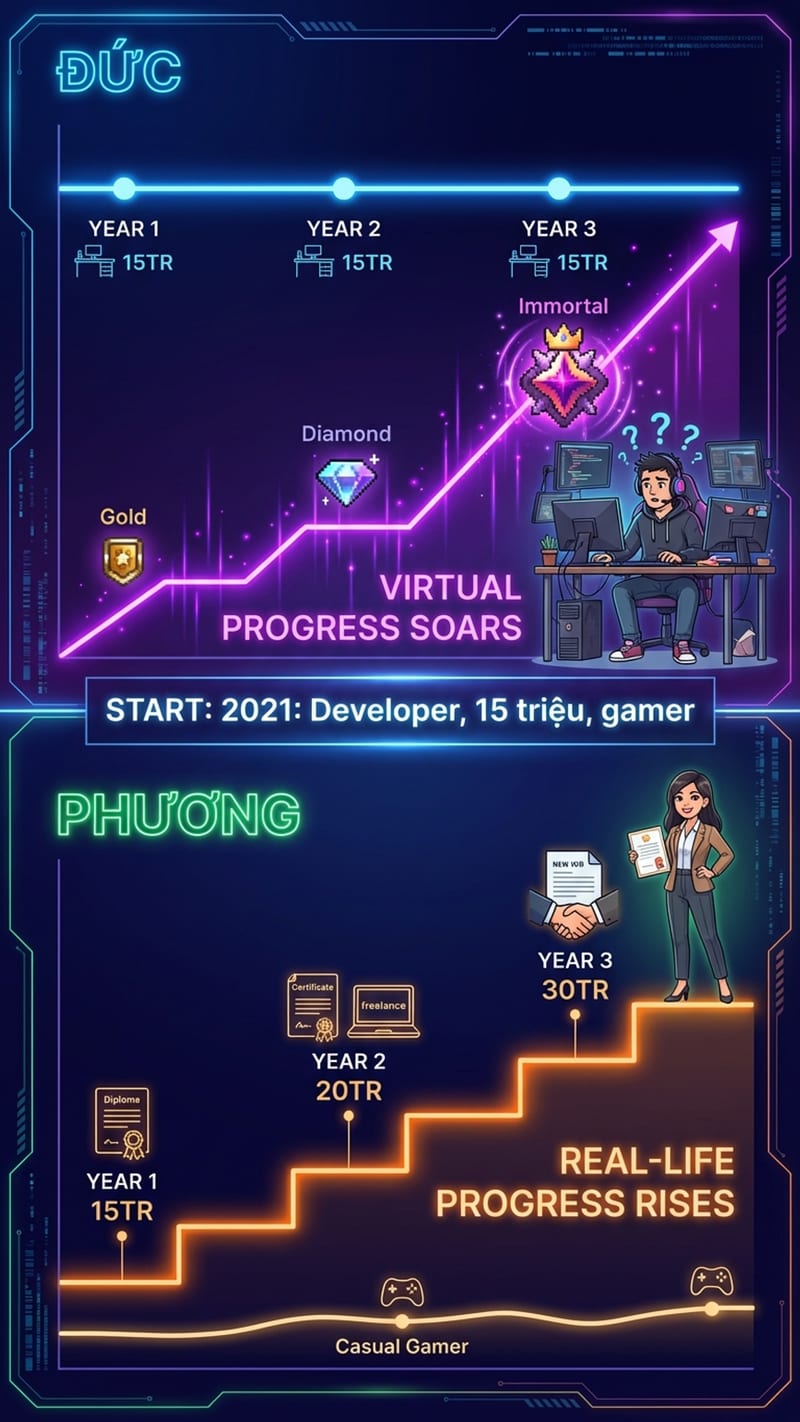 Cùng team có Phương, cũng chơi game, cũng developer. Nhưng Phương chơi 2 tiếng rồi dừng, tối còn học thêm, cuối tuần làm freelance. 3 năm Phương tăng lương 3 lần, nhảy việc lương gấp đôi. Cùng xuất phát điểm, cùng đam mê game — sao kết quả khác nhau hoàn toàn?