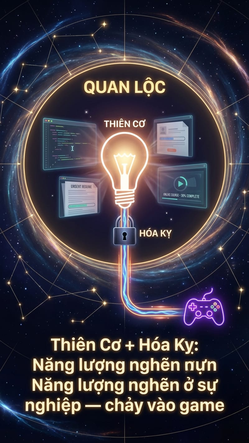 Cung Quan Lộc quyết định bạn làm việc kiểu gì, có thăng tiến hay không. Thiên Cơ ở Quan Lộc là sao thông minh, học nhanh, nhưng hay chán. Làm gì cũng giỏi giai đoạn đầu, nhưng không đủ kiên nhẫn để đi sâu. 3 năm làm một chỗ mà không có thử thách mới thì Thiên Cơ tắt lửa, chuyển năng lượng sang chỗ khác — và game chính là chỗ khác đó.