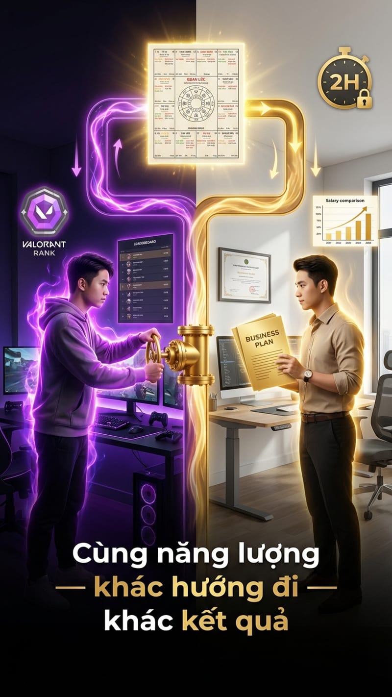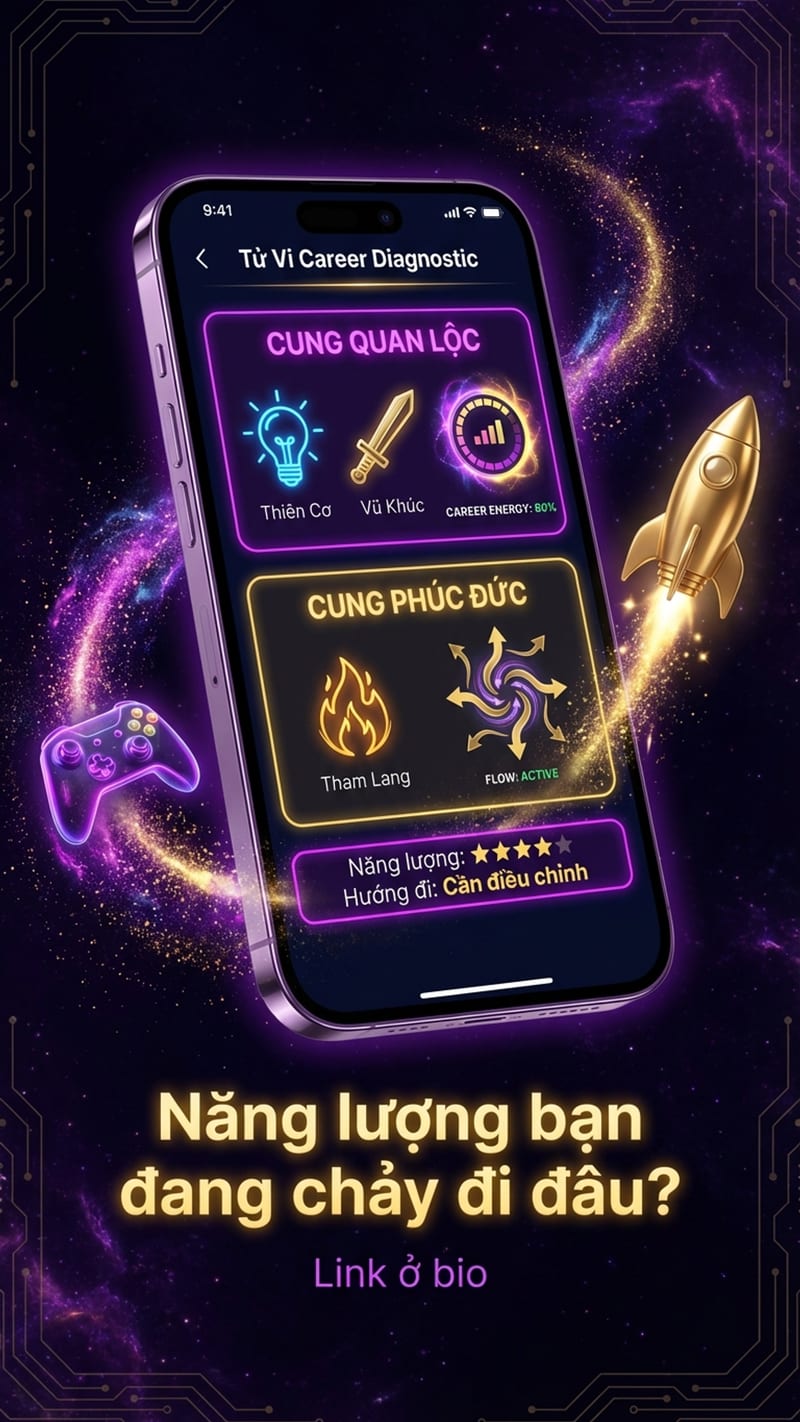 Biết lá số rồi thì điều chỉnh được. Thiên Cơ chán việc thì đổi dự án, học skill mới để não có thử thách. Tham Lang nghiện game thì đặt timer cứng, 2 tiếng tự tắt. Chuyển năng lượng Tham Lang vào side project: thích cày rank thì cày chứng chỉ, thích leo bảng xếp hạng thì leo lương.