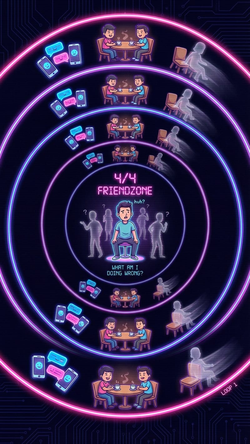 Minh, 24 tuổi, designer, dễ thương, vui tính, ai cũng nói "ổn mà". Nhưng 4 lần thích người ta, 4 lần bị friendzone. Kiểu gì cũng vậy: ban đầu chat vui lắm, hẹn cà phê hai ba lần, rồi đột ngột người ta xa dần. Minh tự hỏi mình thiếu gì — ngoại hình ổn, tính cách ổn, công việc ổn. Tất cả đều ổn nhưng kết quả luôn là số không.