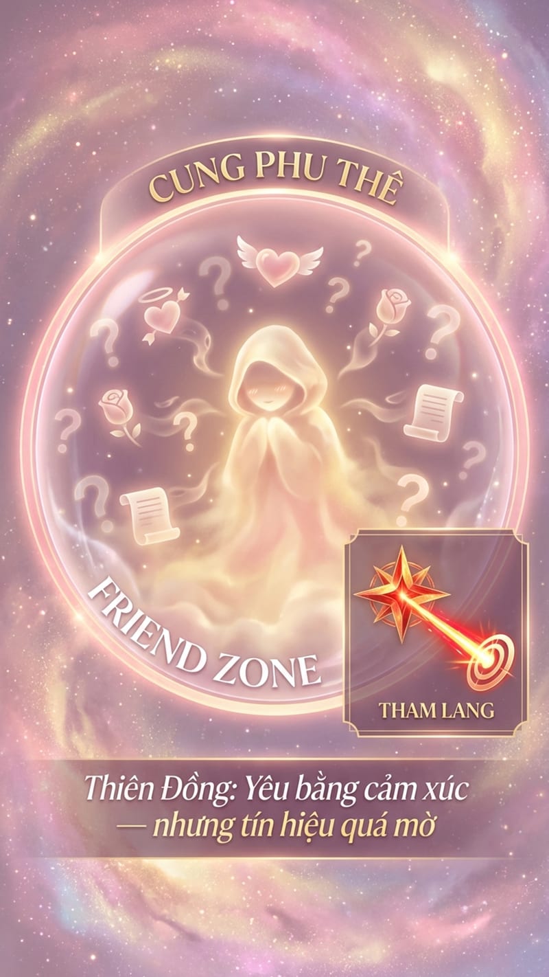 **Thiên Đồng** ở Phu Thê là sao lãng mạn nhất trong 14 chính tinh. Yêu bằng cảm xúc, thích sự ngọt ngào, cần được chiều. Nhưng Thiên Đồng cũng là sao thiếu quyết đoán. Thích người ta mà không dám nói thẳng. Tạo cảm giác bạn bè thân thay vì người yêu tiềm năng. Đối phương không nhận được tín hiệu nên xếp bạn vào ô bạn thân. Minh chính là kiểu này — tốt quá, hiền quá, nên crush không thấy bạn là người yêu.