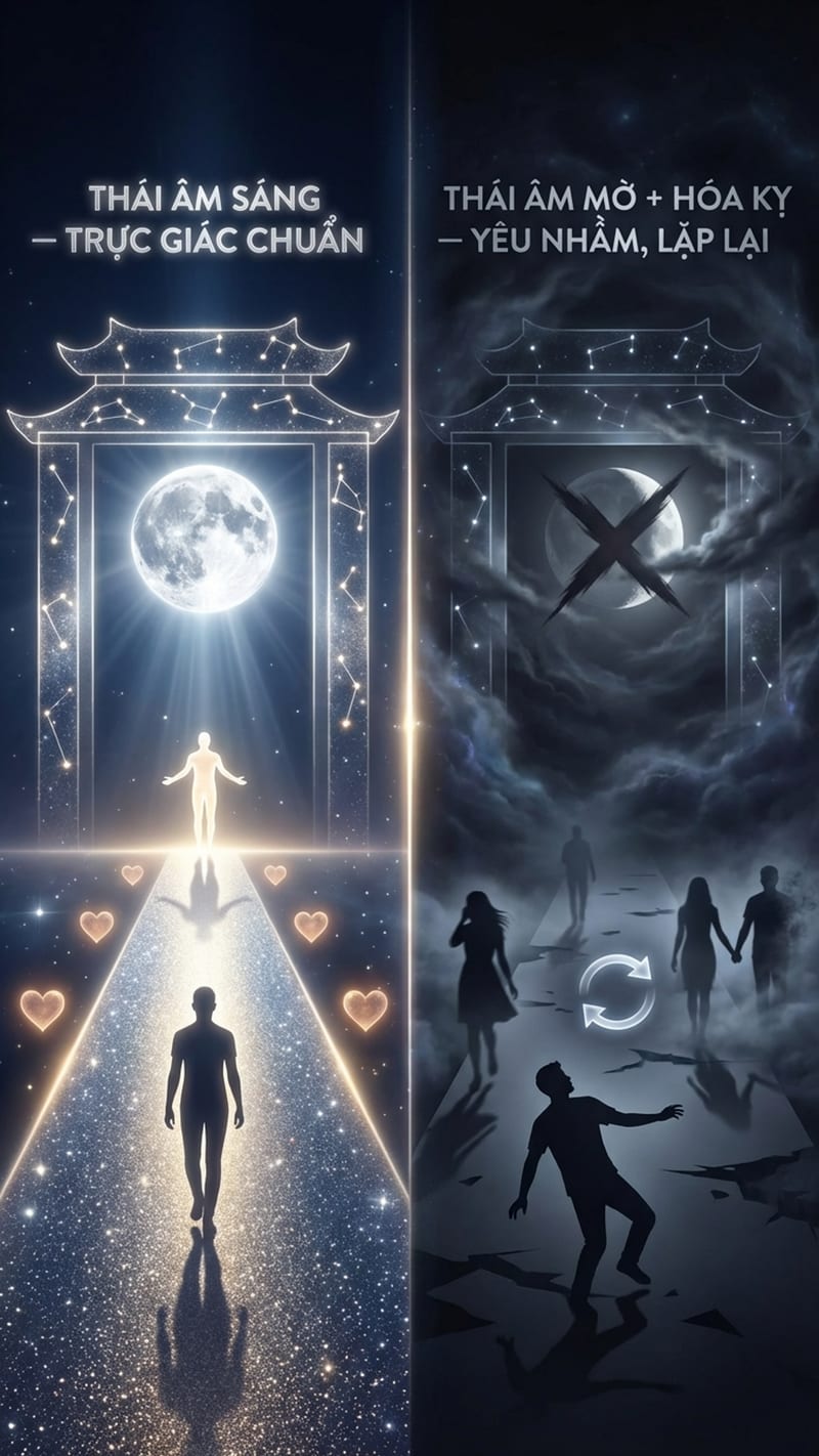 **Thái Âm** ở Phu Thê thì khác. Sao của cảm xúc sâu, nội tâm, dịu dàng. Thái Âm sáng thì trực giác chuẩn, chọn đúng người. Nhưng Thái Âm mờ kèm **Hóa Kỵ** thì yêu nhầm liên tục — thích ai người đó đều không available, hoặc tệ hơn là đã có chủ. Cứ lặp đi lặp lại pattern yêu người không thể yêu.